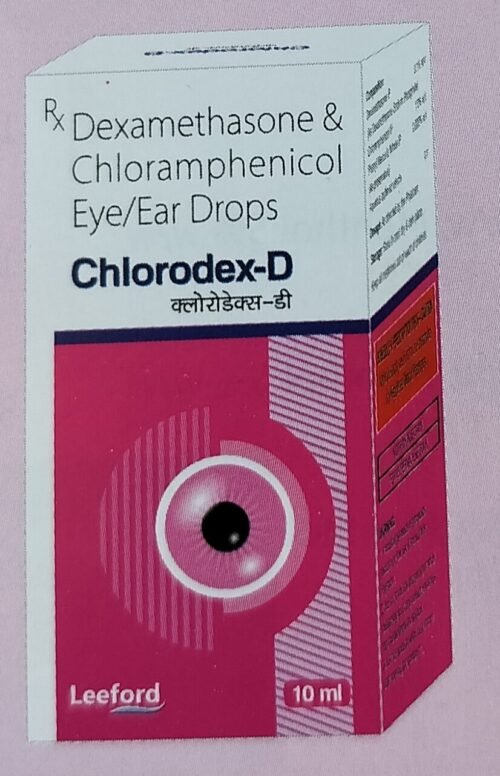 Chlorodex-D Eye/Ear Drops contain Chloramphenicol (antibiotic) and Dexamethasone (steroid). Chloramphenicol stops the growth of bacteria causing infection, while dexamethasone reduces inflammation, redness, and swelling.