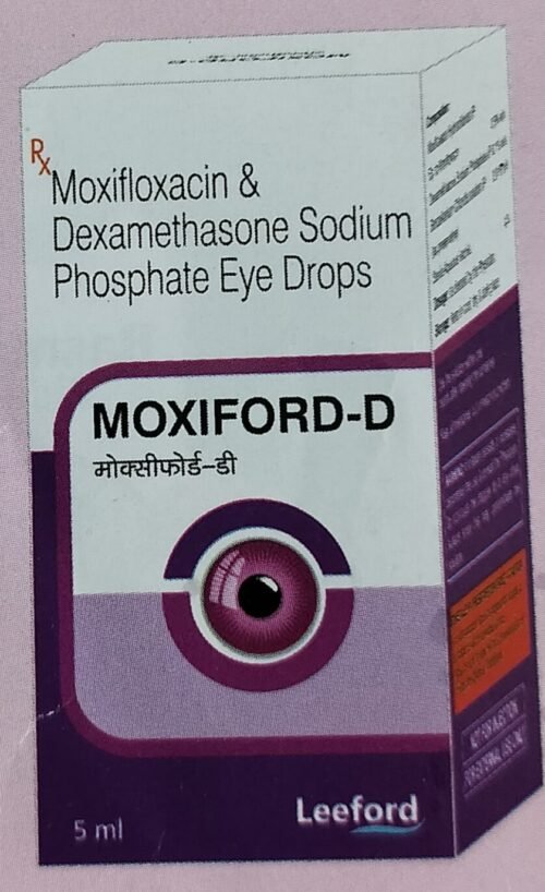 Moxiford-D Eye Drop contains Moxifloxacin (antibiotic) and Dexamethasone (steroid). Moxifloxacin kills bacteria that cause eye infections, while dexamethasone reduces inflammation, redness, and swelling.